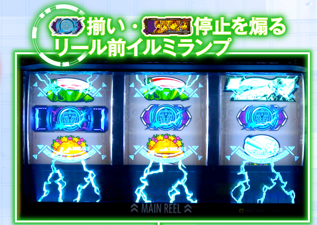 動き:リールロックと共に左からリールがプルプルしながら赤のイルミがナビ部分に流れる