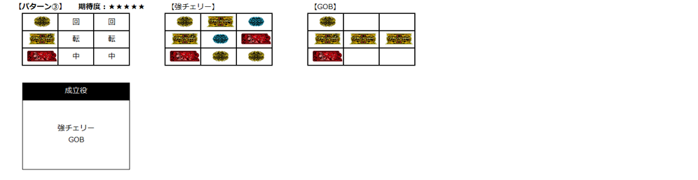 その代わり「黄/GOB/赤BAR」が停止した時は「強チェリーor GOB揃い」となりますので