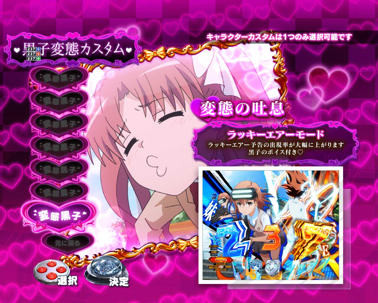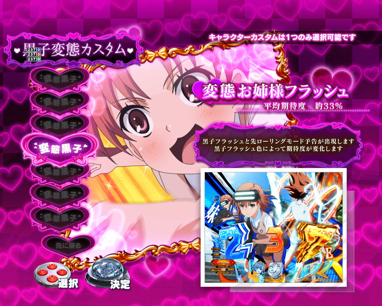 突破チャレンジ成功時の最後に美琴が表示されるシーンで、十字キーを入力すると初回RUSHから「美琴追跡モード」や「妹達舞踏モード」などを選ぶことができます!