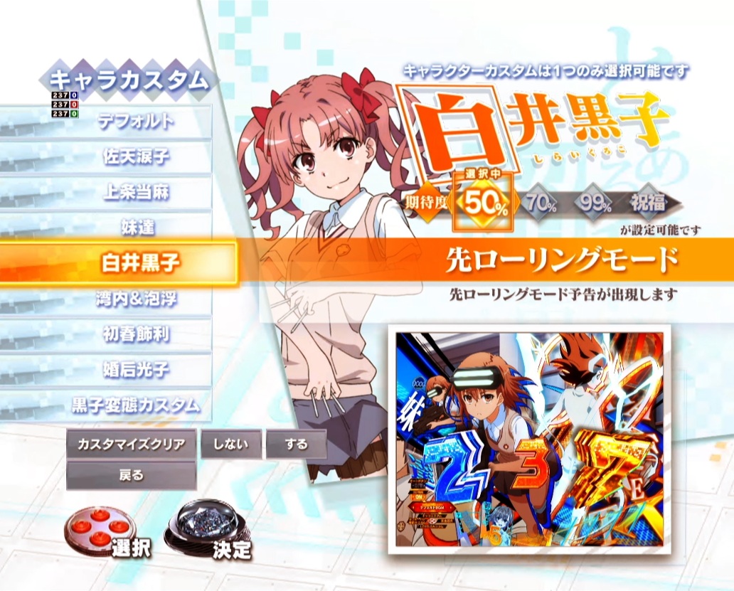 私は「超 美琴追跡モード」、「超 妹達舞踏モード」、「超 食蜂選択モード」、「超 黒子浄化モード」の4モードを遊技する際は、「先読みカスタム」の「なし」をカスタムするのが好きです。