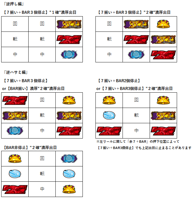 ※右リールから止めないと出目的にBAR図柄が止まらないため。
